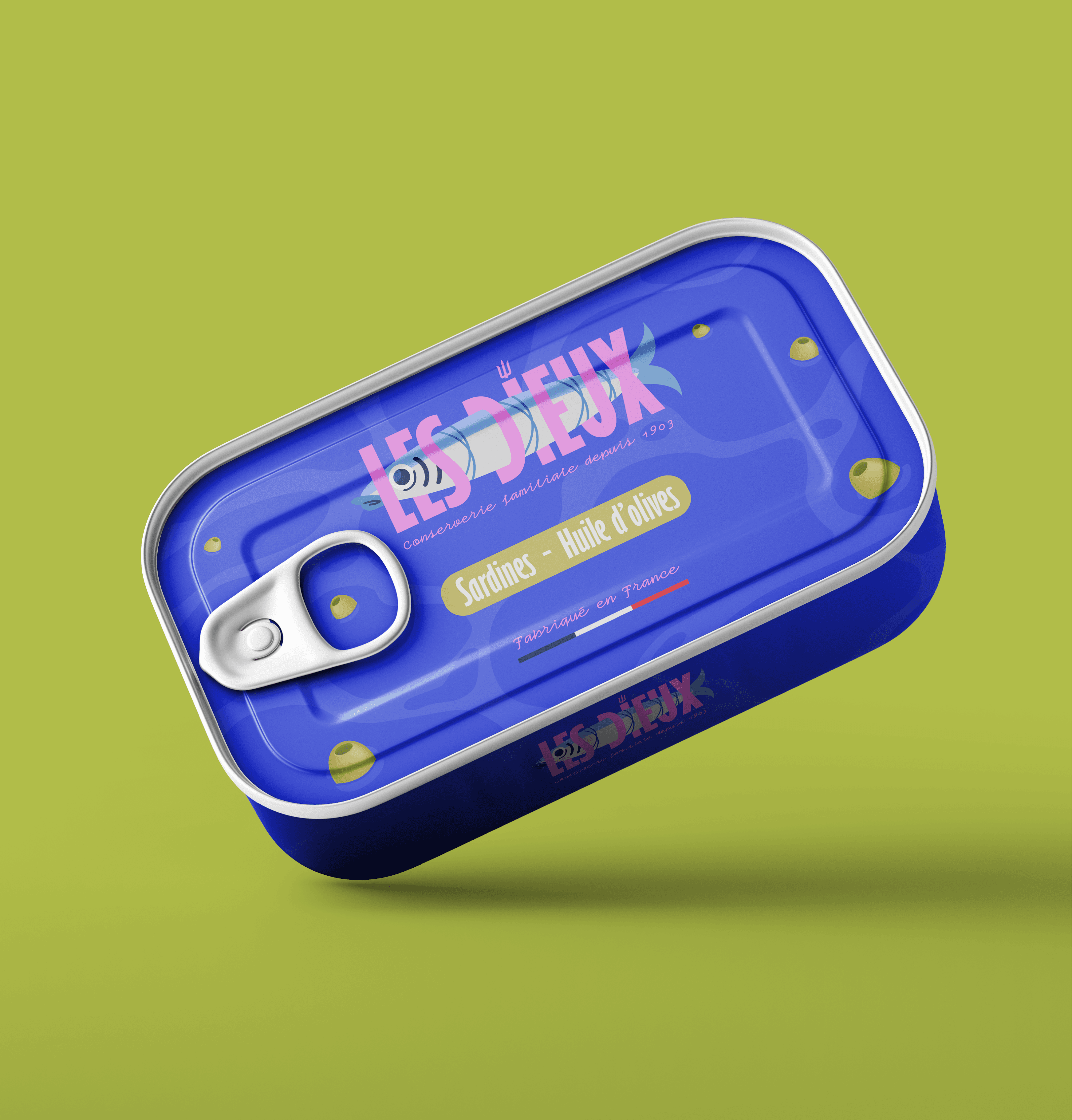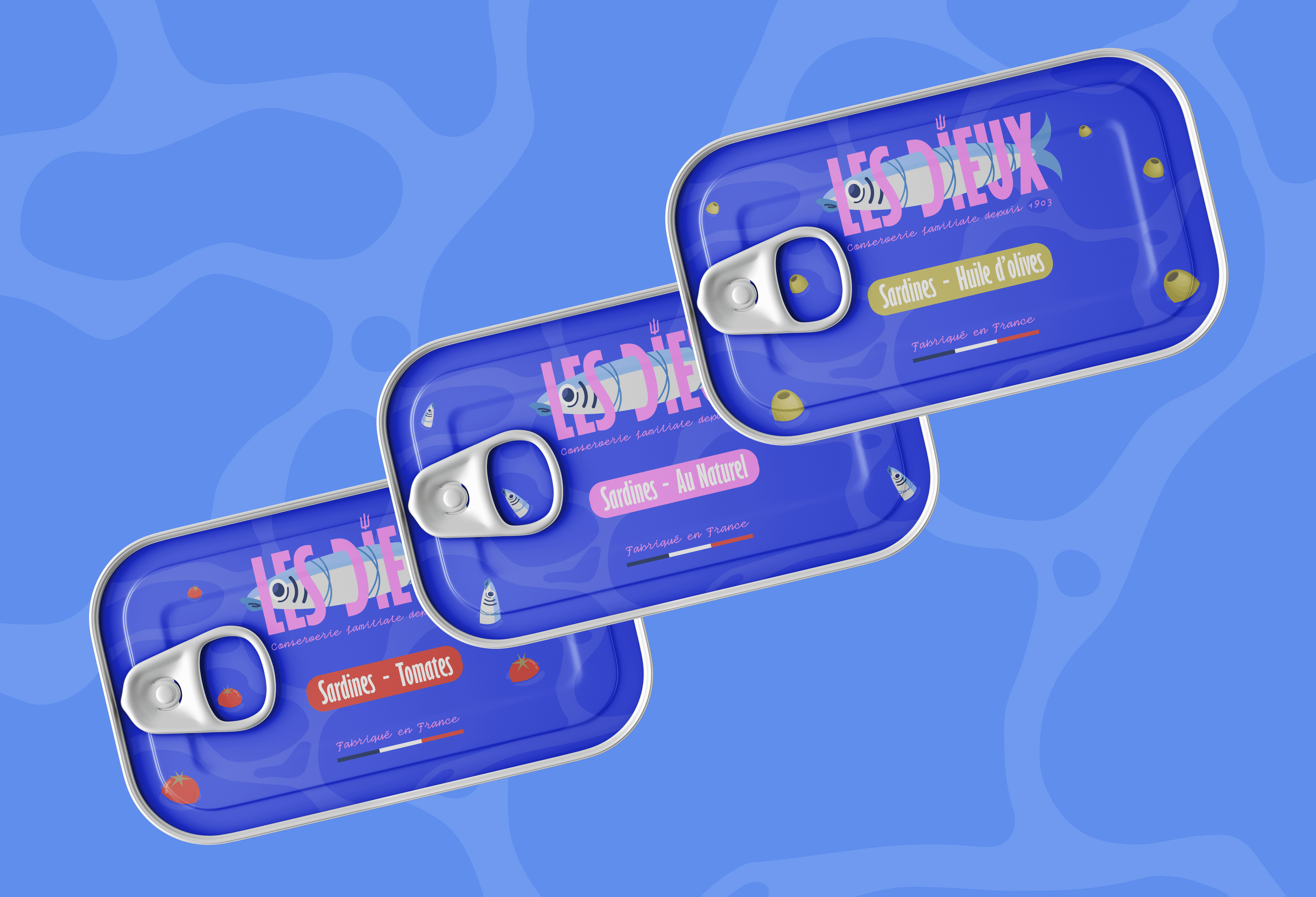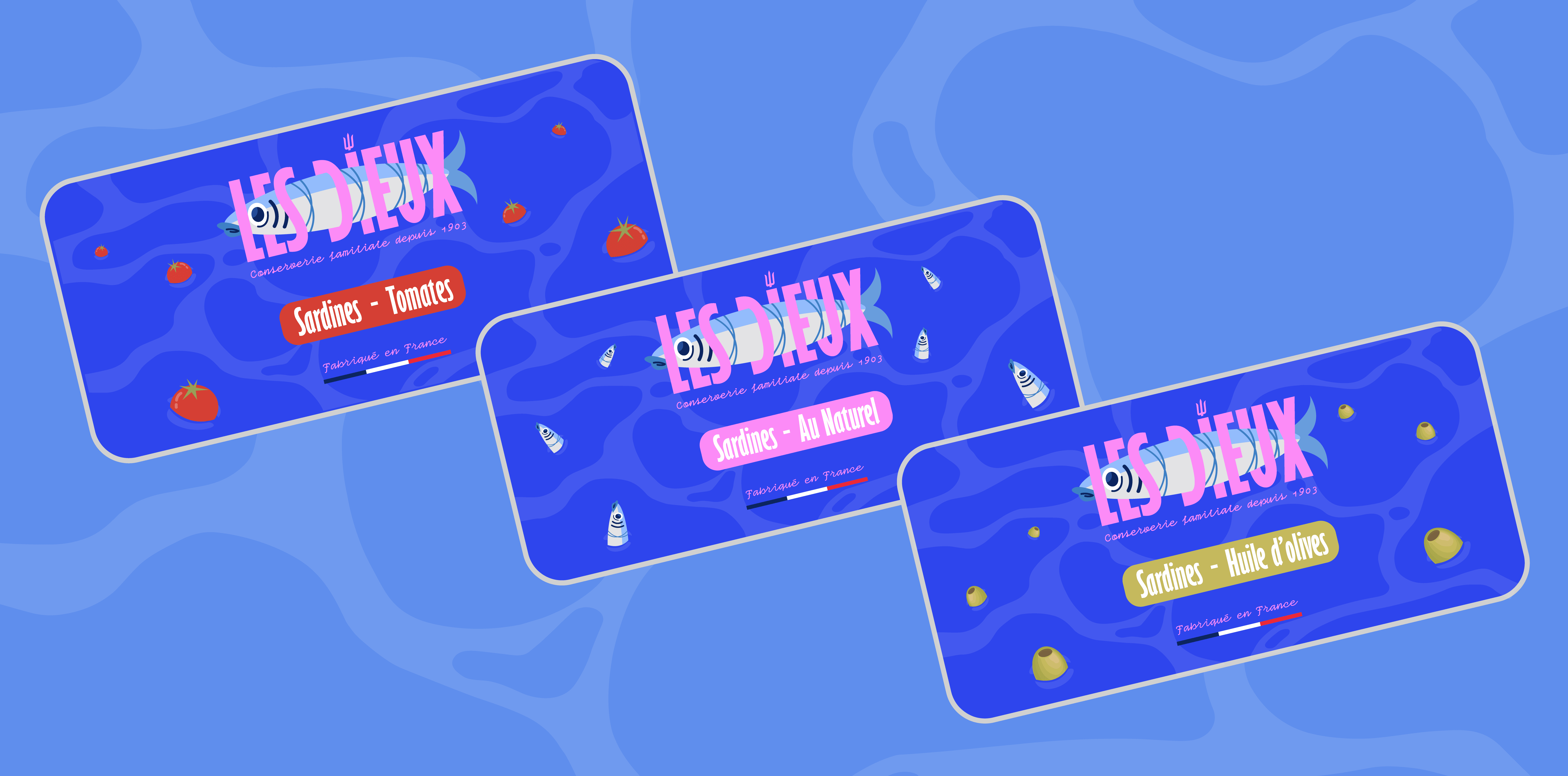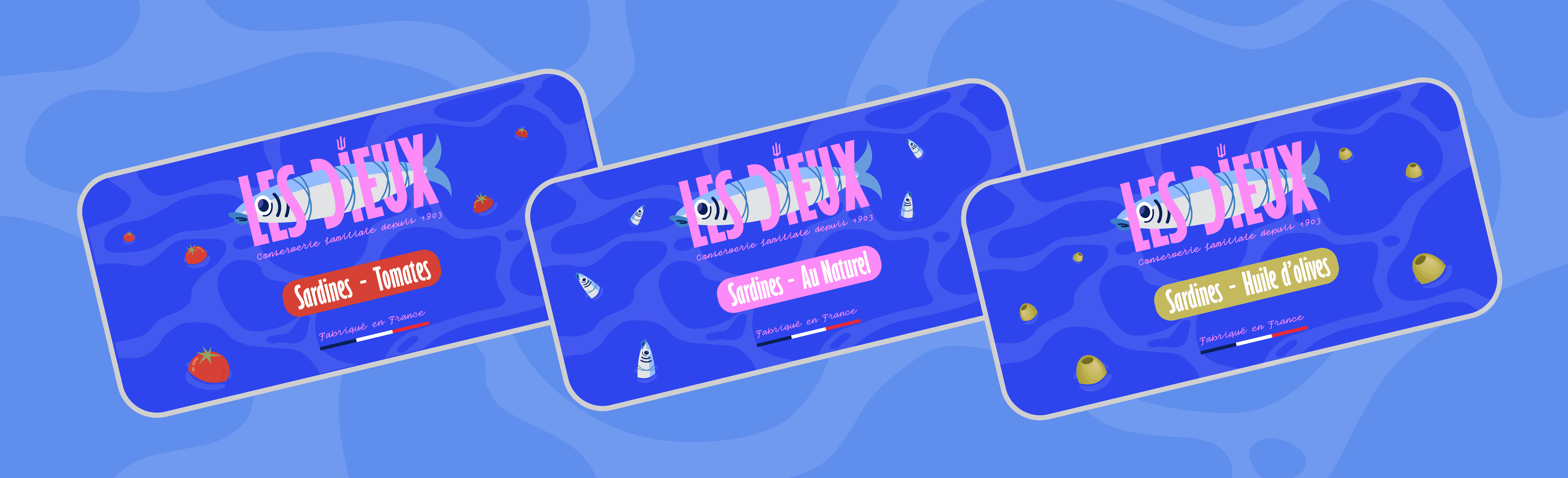 Design d'une une nouvelle identité graphique pour la marque Les Dieux faisant son retour sur le marché des conserves de sardines. [Projet d'école]